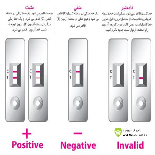 صبر کنید تا خطوط رنگی ظاهر شود و بعد از 15 دقیقه نتیجه تست را بخوانید.نتیجه تست روی عکس نشان داده شده است.
